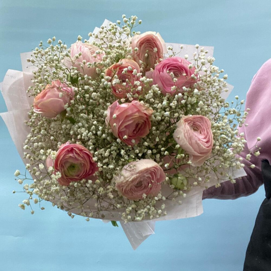 Букет из розовых ранункулюсов с белой гипсофилой в Евпатории