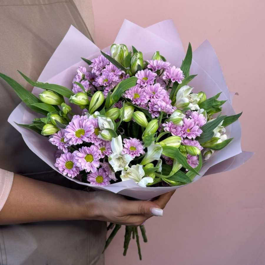 На фото букет «сиреневая соната». В составе: альстромерия 3 шт, хризантема кустовая 5 шт, дизайнерская упаковка 1 шт, атласная лента 1 шт, . Все цветы свежие и ароматные, букет красиво оформлен и отлично подходит для подарка. Доступна доставка цветов или самовывоз.