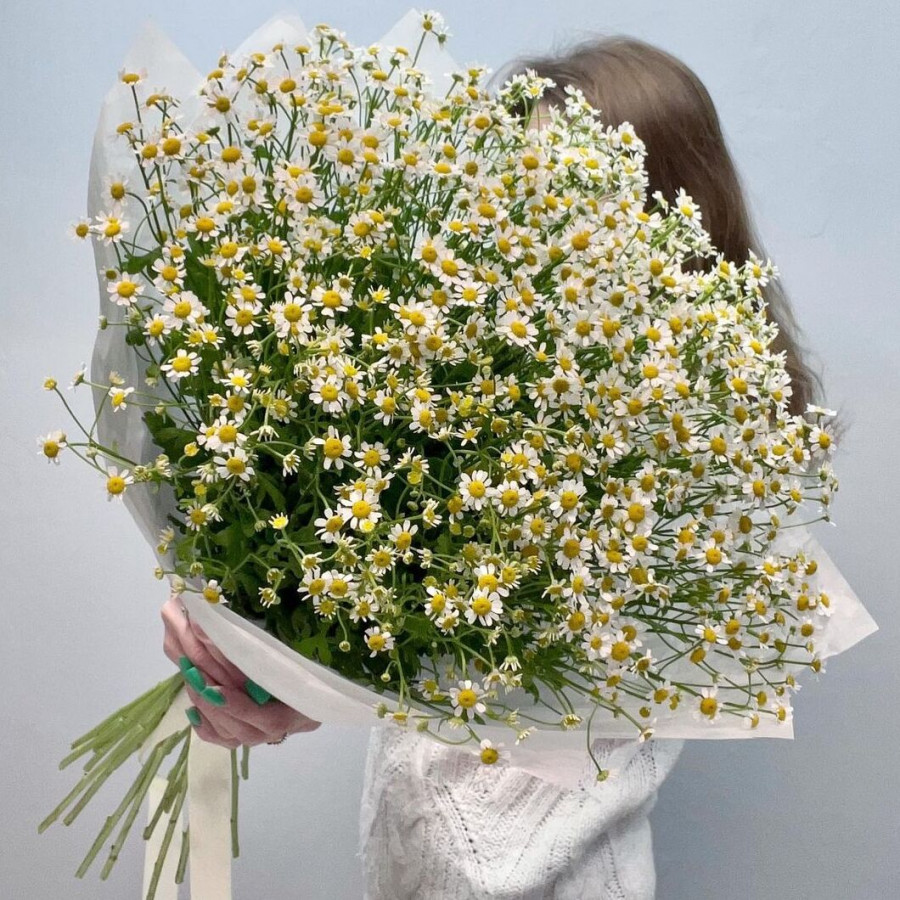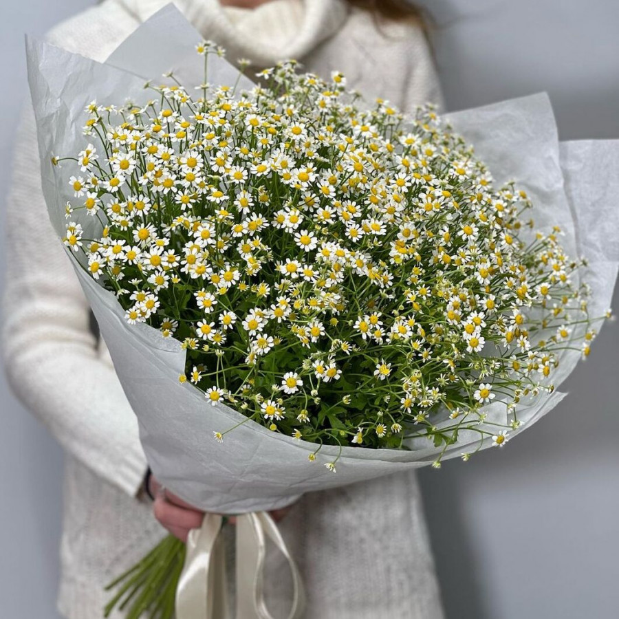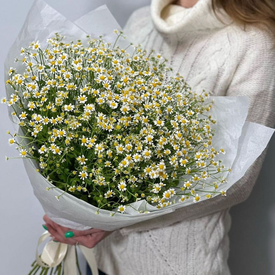 На фото маленькие ромашки в крафте. В составе: танацетум 15 шт, крафт-бумага 1 шт, . Все цветы свежие и ароматные, букет красиво оформлен и отлично подходит для подарка. Доступна доставка цветов или самовывоз.